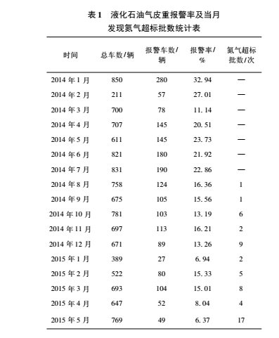 1.發現氮氣超標。煉油部與計量中心于2014 年 7 月出臺聯動流程后,出廠的液化石油氣車況改善很大,表 1 是煉油部出廠的液化石油氣在 2014 年 ~ 2015 年 5 月,每月的車輛皮重報警率統計和推出聯動流程后當月發現氮氣超標的批數統計。在這段時間裝運液化石油氣的車輛共有 230余部,多為散戶。管控力度大時,如 2015 年 5 月,標準皮重的維護權限由車間專人接管,共查到 17批氮氣超標車輛,當月的皮重報警率最 低,為 6. 37% 。