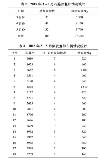 2.主輔比對數據,復卸次數減少,虧損率下降。石腦油是天津石化采購的大宗物料,物資裝備部委托某大型運輸公司承運。我們的卸凈控制指標是,當供方磅單凈重大于我方凈重 90 kg時,要求司機回卸車棧臺復卸。因棧臺的卸料泵功率較低,并且較陳舊,卸料速度較慢,且因棧臺人員顧慮泵空轉,損傷泵體,造成卸料不凈,這是客觀原因。還有主觀原因,部分車輛幾次三番發生復卸現象,并能卸出超過 60 kg 的油料,有故意不卸凈傾向。這些情況承運公司并不知曉。我們通過統計比對數據,統計頻發復卸車輛的情況 ( 見表 2 和表 3) ,通報并敦促運輸公司管理層,加強對承運司機的管理和考核,使司機自覺卸凈。