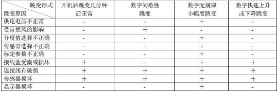 從表中可以看出,開機后跳變幾分鐘后正常和數字快速上升或下降跳變與接線盒受潮或損壞、傳感器損壞、連接線有破損有直接關系;間歇性跳變與傳感器損壞和連接線有破損有直接關系;數字無規律小幅度跳變與所有因素均可能有關,所以在查找原因時有一定困難,只能用排除法進行查找原因。