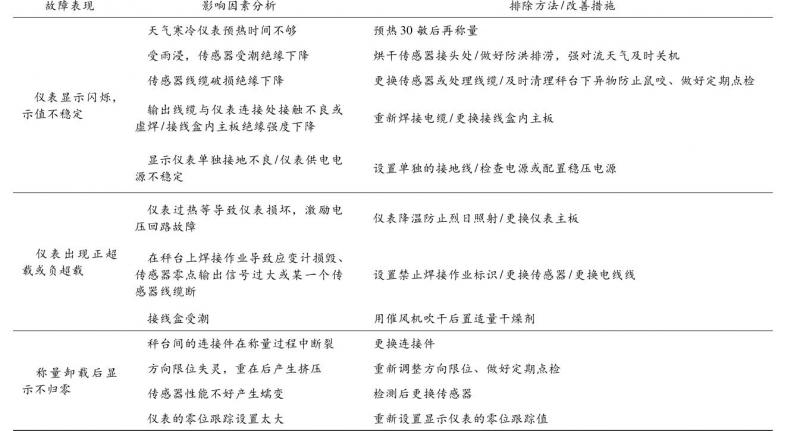 地磅常見故障分析及改善措施如表1所示。
